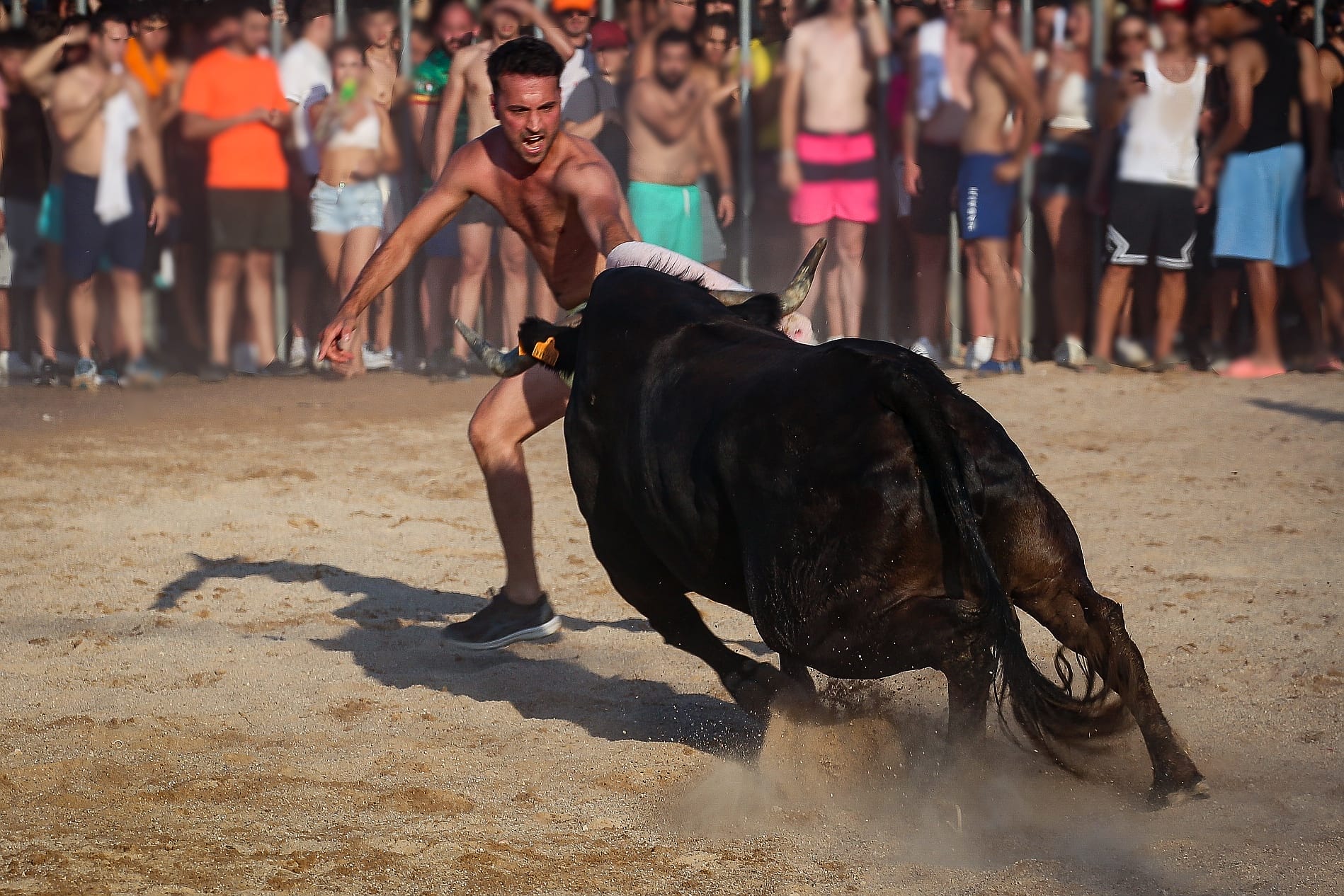 In der Arena selbst übernehmen Hobby-Toreros das Geschehen – junge Männer in Badeshorts, die versuchen, die Stiere in Richtung Hafenbecken zu treiben. Sie springen selbst ins Wasser, rufen die Tiere, reizen sie – und fallen dabei mehr oder weniger gezielt und geschickt selbst über die Kante. Wenn ein Stier zögert, lange widersteht und die improvisierten Toreros auflaufen lässt, kommentiert das Publikum mit Rufen und Applaus – und erklärt das Tier mitunter zum Sieger des Abends. Es ist Theater, Volksfest und Mutprobe zugleich, und die Grenze zwischen Spontaneität und Ritual ist an diesem Abend fließend.