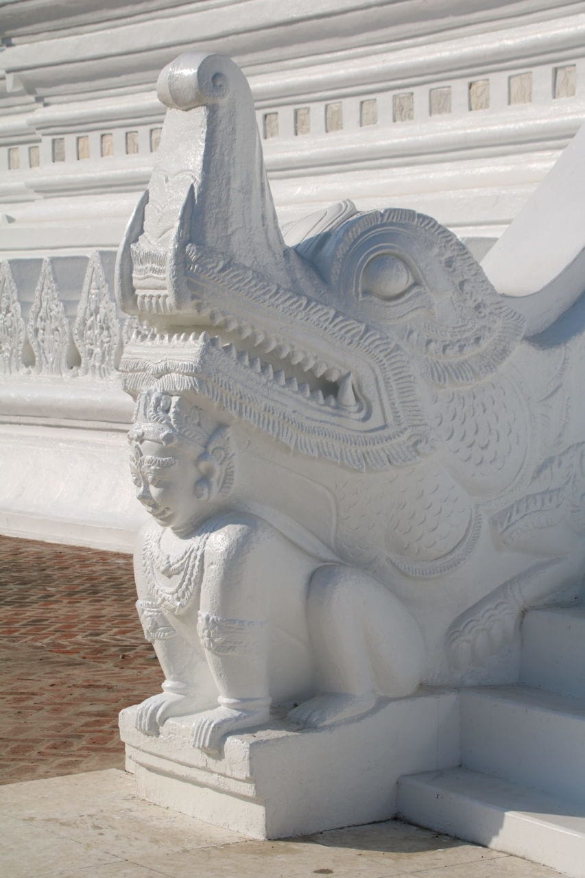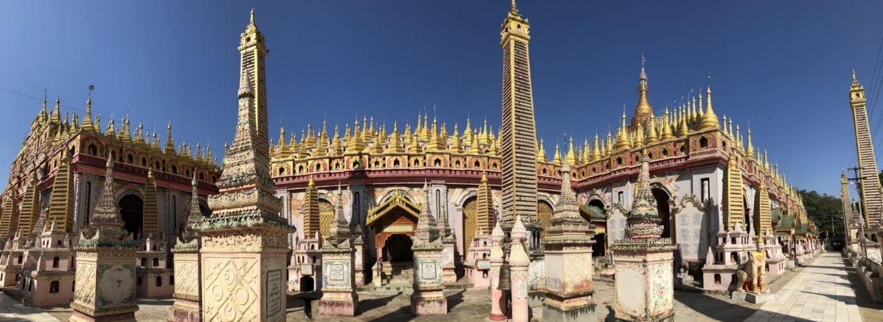 Fertig gestellt und elegant in weiß getaucht findet sich weiter Fluss abwärts die Hsinbyume Pagode, welche König Bagyidaw für seine Frau errichten ließ. Die wellenförmige gestaltete Fassade mit ihren kleinen Türmchen ist ein tolles Fotomotiv!