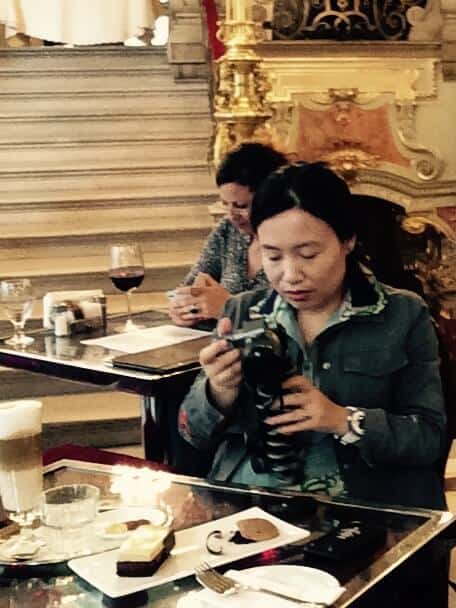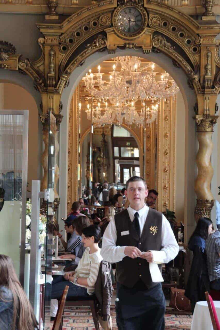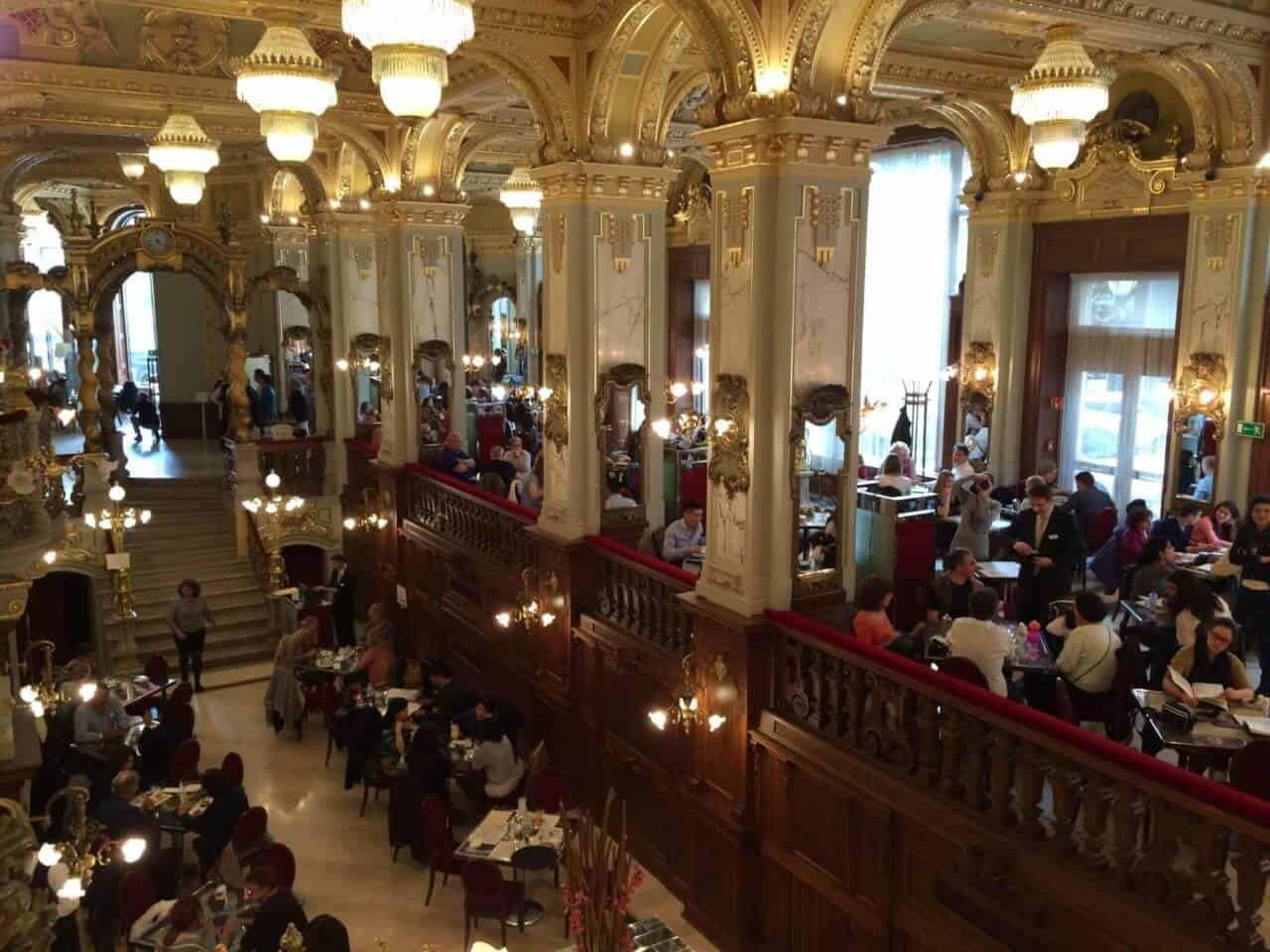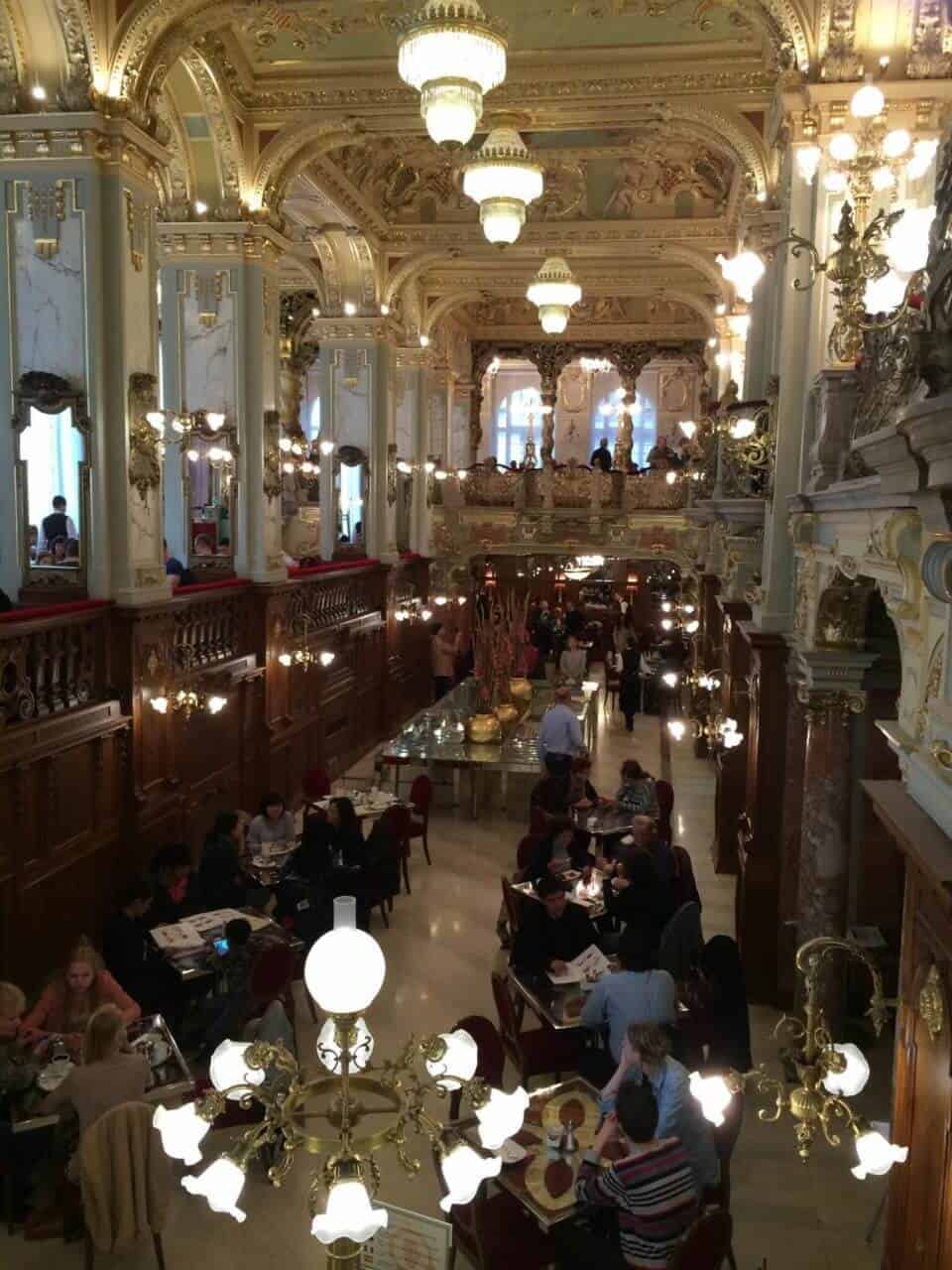 Das New York Café beeindruckt seit der erfolgreichen Renovierung 2006 mit dem Glanz früherer Jahrhunderte. Die Decken und Wände sind reich verziert – Stuck, Figuren und vergoldete Leuchter wohin man sieht. Die Inneneinrichtung ist ein Genuss, genau wie die hervorragende Küche. Das findet auch die Dame aus Asien am Nebentisch, welche mit eigens mitgebrachten Mini-Stativ diverse Selfies aus unterschiedlichsten Perspektiven schießt und dabei fast das servierte Gedeck vergisst.
