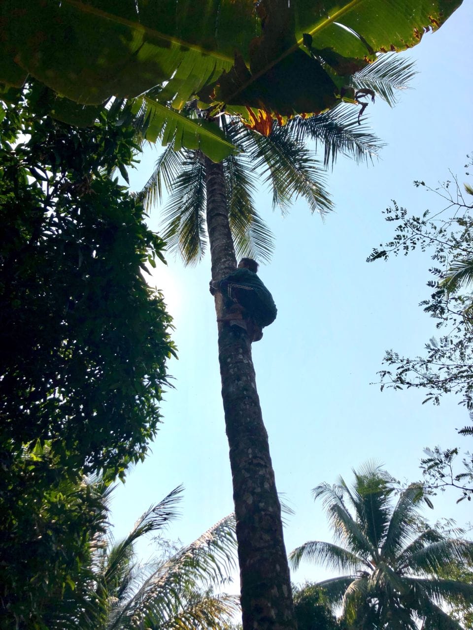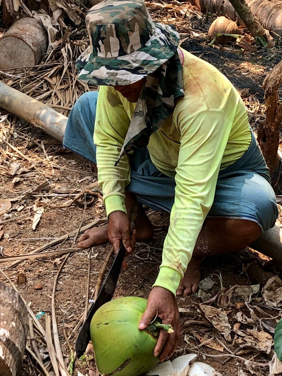 , wie sie in einem kleinen Dorf ohne jegliche Einkaufsmöglichkeiten auf der Suche nach frischer Kokosmilch war. Nach einem Austausch mit einem jungen Mann zeigte dieser auf eine nahestehende Kokospalme. Als sie nickte, kletterte er spontan auf die ca. 10 Meter hohe Palme und schnitt mehrere Kokosnüsse ab, welche er Ihr anschließend aufspaltete und servierte.